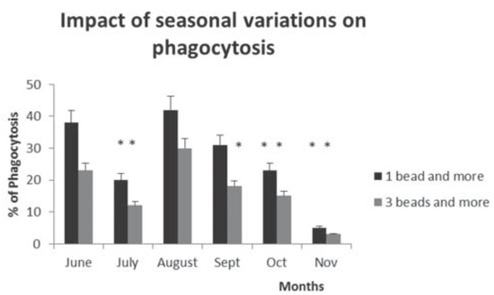 For seasonal variations, the results obtained showed that phagocytic activity as well as efficacy was significantly reduced for four time points out of six with a quite important reduction in July as well in November. Results from Crassostrea gigas[23] showed that phagocytosis index was significantly reduced during spawning in June-July and November-December. In the present study, we have observed early summer a decrease of the phagocytosis activity which coincide with the spawning.[24] However, a more dramatic reduction of phagocytosis activity was observed in November, This could be the result of a combined action of spawning and cold water temperature. Though, confirmation of spawning in the fall shall be done.