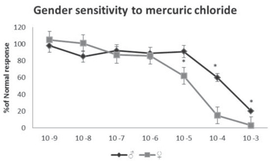 For gender difference, we have observed that the phagocytic activity in females was significantly reduced when the cells were exposed to 10–5 M of mercuric chloride, while significant reduction for males was observed 10 fold higher (10–4 M). It has already been published similar results in vertebrates, following in vitro incubations of immune cells with heavy metals. [25] However, to our knowledge, this is the first demonstration of a gender difference to mercury, in bivalves.