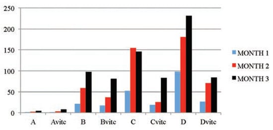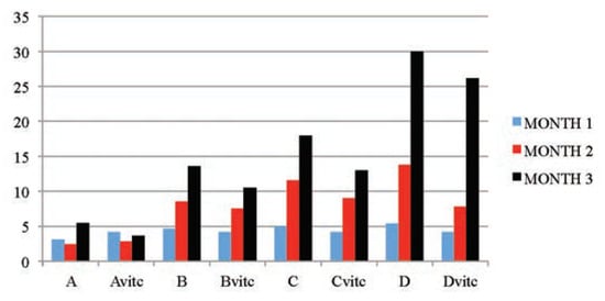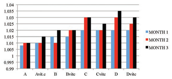 The results obtained in Table 2 and Figure 1 indicated that the urine SG values of the test subgroups were significantly higher when compared to the control subgroups (A and Avitc) at P≤01. The increase in values was found to be dose and exposure-time dependent. The control subgroups had no statistical difference between them, meaning that vitamin C (1 g/L) used in medicating the drinking water for subgroup Avitc was not toxic. This confirms that the changes observed on the test subgroups were subject to only PQ toxicity. Similarly, significant decreases in SG values were observed in PQ treated subgroups maintained with vitamin C medicated water (Bvit.c, Cvit.c and Dvit.c) than the subgroups on PQ treatment only (B, C and D), especially in samples collected at the end of months 2 and 3, and mainly on rats subgroups dosed 4 mg and 6 mg/kg PQ. Also within each test subgroup, significant increases (P≤0.01) were observed in the exposure time comparison between months 2 and 3 against month 1 (e.g. Bvitc: month 1 vs month 2 or 3). This confirmed that dose effects were increasing proportionately with exposure time of the study.