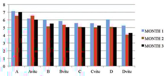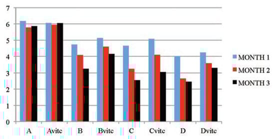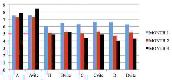 Table 5 and Figure 3, Figure 4, Figure 5 and Figure 6 below illustrated that PQ exposure caused significant increases in serum levels of urea and creatinine and reductions in serum levels of glucose and total protein concentrations (P≤0.01) in rats treated with (2, 4 and 6 mg/kg PQ) at month 1 (28th day), month 2 (56th day) and month 3 (84th day) compared to those of the respective monthly control subgroups, and the comparison was found to be dependent on the dose given and the exposure-time of treatment. The control subgroups of each parametric treatment (Figure 3, Figure 4, Figure 5 and Figure 6) showed no observable significant changes when the subgroups on vitamin C medicated water maintenance (Avitc) were compared to the subgroup maintained on ordinary drinking water with negligible vitamin C content (A). But on comparing the test subgroups (PQ only vs PQ + vit. C), a significant decrease in values were observed on the vitamin C medicated subgroups at each dosed subgroup and at each month in serum urea and creatinine, while a significant increase were similarly observed on the same subgroups in serum total protein and glucose levels. When an exposuretime comparison was done on the test subgroups (e.g. subgroup B: month 1 vs months 2 or 3) in all the parameters assayed. There were significant increases for urea and creatinine serum level while significant decreases for total protein and glucose serum levels were observed in the data obtained.