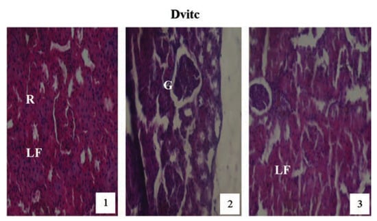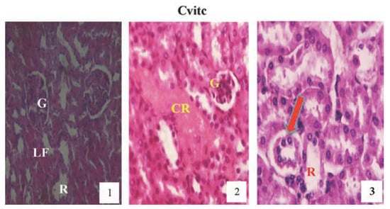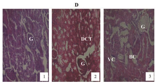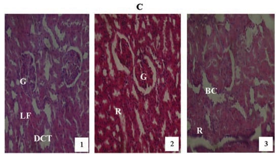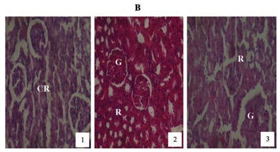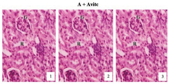 Histological examination of the kidney sections (Figure 7) of the control subgroups A and Avitc revealed normal cortex with normal renal corpuscles, proximal and distal tubules as represented at months (1), (2) and (3) in the slide pictures. These pictures are showing clearly the glomeruli tuft (G) with its surrounding Bowman’s capsules and the renal tubules, lined by simple cuboidal or columnar epithelium and the renal vein running all through the tubular cells, emptying at the tuft of the glomerulus as capillaries.
