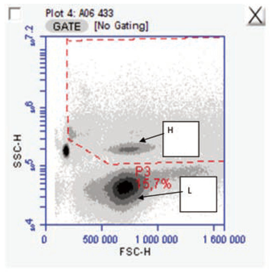 Using a density plot of the complexity (SSC) versus the size of the cells (FSC), we could discriminate 2 cell populations, L and H (Figure 1).