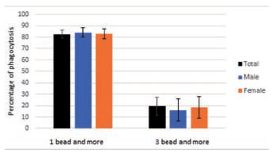 A mean percentage of phagocytic activity (1 bead and more) and efficiency (3 beads and more) of 82.6±4.4 and 19.5±9.6 respectively has been obtained for the entire cohort. When results were analyzed for males and females separately no significant differences between them were pointed out.