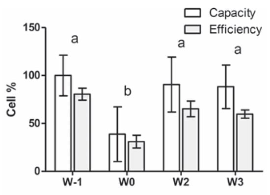 Phagocytic capacity and efficiency of hemocytes from Mytilus edulis according to spawning period. Mussels were sacrificed one week before (W-1) spawning, during (W0) spawning, two and three weeks after spawning period (W2 and W3, respectively).Different letters indicate, for capacity and efficiency, a significant difference (ANOVA, P<0.0001).