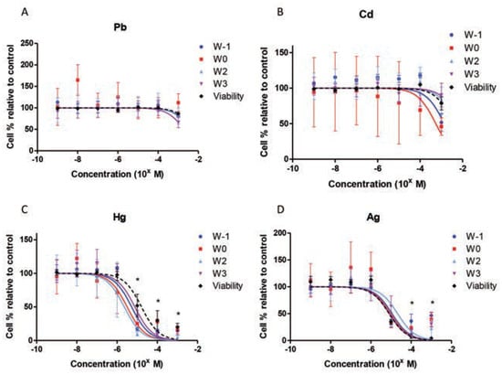 Phagocytic capacity and viability of hemocytes exposed to metals [A: lead (Pb), B: cadmium (Cd), C: mercury (Hg) and D: silver (Ag)] from Mytilus edulis in or out spawning period. Mussels were sacrificed one week before (W-1) spawning, during (W0) spawning, two and three weeks after spawning period (W2 and W3, respectively). Controls were not exposed to metals. To compare difference between concentrations: *ANOVA/Kruskal-Wallis P<0.05.