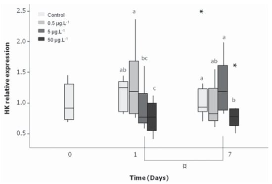 Relative gene expression of hexokinase during ethofumesate exposure at 10°C in white muscle of roach. Different letters indicate significant differences for a same time (P<0.05). *Corresponds to outliers. Bars with ¤ indicate significant differences for a same concentration.