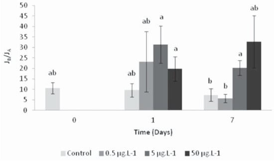 JB/JA ratio during ethofumesate exposure at 17°C in white muscle of roach. Different letters indicate significant differences (P<0.05).
