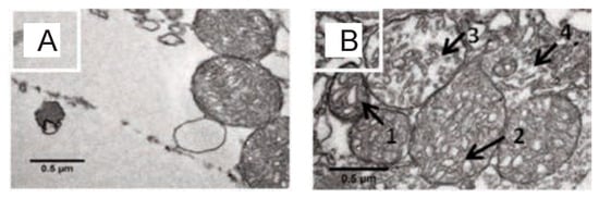 Ultrastructure of muscular mitochondria in roach exposed to 50 µg.L−1 after one day of ethofumesate exposure at 10°C. (A) Electron micrograph from control roach muscle showing round regular mitochondria. (B) Electron micrograph from contaminated roach muscle showing disrupted outer mitochondrial membrane (1), dilated cristae (2), destroyed cristae and absent matrix (3), and mitochondria entirely destroyed (4).
