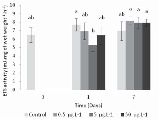 Electron transport system activity during ethofumesate 17°C exposure in white muscle of roach. Different letters indicate significant differences (P<0.05).