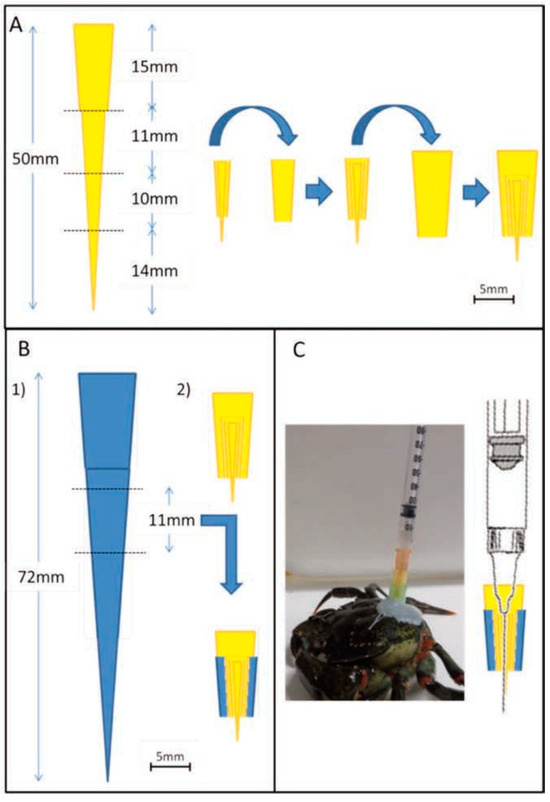 Injection device: graphical depiction of fabrication using 200 µL and 1000 µL pipette tips. A) Cutting and assembly of parts derived from the 200 µL tips. B) 1. Withdrawal of an 11 mm middle section from a 1000 µL tip and 2. completion of the injection device. C) Shore crab equipped with injection device fixed with epoxy on his carapace and schematic representation of the inserted syringe.