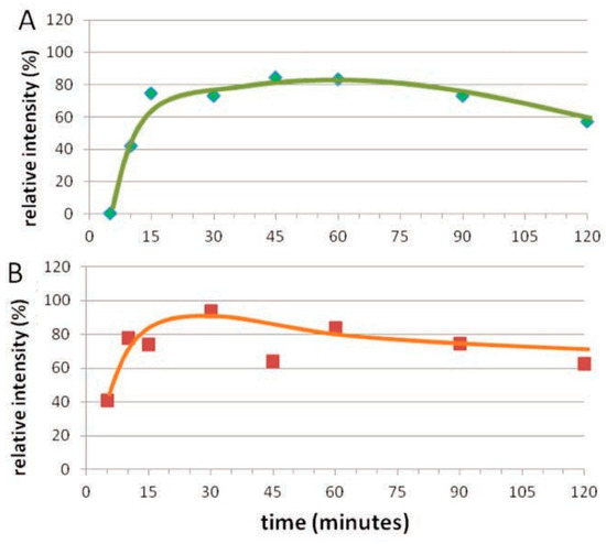 Relative intensity of indigotine color (E132) in crab haemolymph. A) Lateral injection (t=0) and contra-lateral sampling through the right and the left fourth paraeopod, respectively. B) Dorsal injection through the injection device (t=0) and lateral sampling at the left fourth paraeopod.
