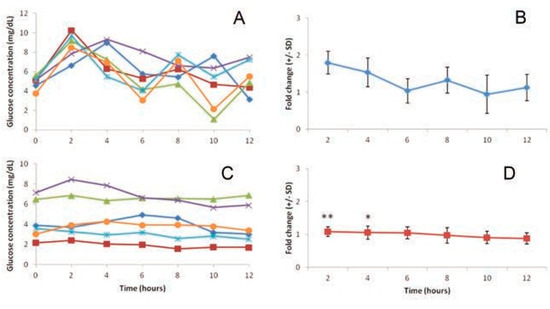 Variations of haemolymph glucose in crabs over a 12 h light cycle. A) Glucose levels of individual crabs after sampling via the fourth paraeopod; B) fold change in glycaemia after sampling via the fourth paraeopod (n=6), means±SD; C) glucose levels of individual crabs after sampling via the injection device; D) fold change in glycaemia after sampling via the injection device (n=6), means±SD. Significance compared with control determined by t-test *P<0.05, **P<0.01.
