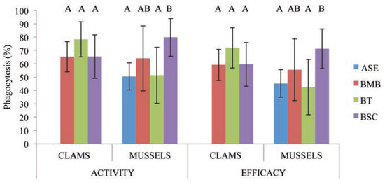 The hemocytes viability and phagocytosis were then evaluated for the polluted stations (BT and BSC) compared with reference stations but only with BMB for M. arenaria because of salinity impact observed in Figure 3. For both species, no variations were observed in the hemocytes viability despite the anthropic activities and known contamination present at BT and BSC. For M. arenaria, no differences were observed in hemocytes phagocytic activity and efficacy, but significant variation occurs for M. edulis. This variation was observed between ASE and only one polluted station (BSC), where the phagocytosis significantly increased. However, no modulation of the phagocytic competence has been observed when BMB was compared with BT and BSC for both species. On the other side, the phagocytosis of mussel hemocytes of the two polluted stations differs significantly and was increased at BSC (Figure 3). The hemocytes viability and phagocytosis of each species were compared to determine the immunological modulation at each station. In the reference stations, ASE and BMB, no significant differences were observed between clams and mussels. In contrast, the hemocytes viability showed no differences in contaminated stations, at BT and BSC, but the immune response was significantly modulated. In BT, the phagocytic competence of soft-shell clams was higher than for mussels. In BSC, mussels’ hemocytes had higher phagocytic capacity (1 bead and more) but no differences other were observed for the phagocytic efficacy (3 beads and more).