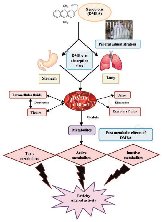 7,12-Dimethylbenz(a) anthracene (DMBA) is a class of polycyclic aromatic hydrocarbon (PAH). It is absorbed mainly through the skin, respiratory, intestinal tracts; by ingestion and inhalation.[10] The induction of gastric cancer in rats by injecting DMBA in the glandular stomach has been reported in literature.[11] Previous reports have also shown the DMBA induced tumor formation in forestomach of mouse.[12] It was also found that lungs showed occasional tumors after intraperitoneal injection of DMBA.[13] In other reports, DMBA has been found to induce neoplasms in the mammary gland, liver, heart and lungs after being metabolically activated.[14]