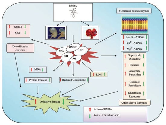 In nutshell, we conclude that the normal cellular protective response is altered by tissue damage caused by a xenobiotic. This damage depends on the bioavailability of xenobiotic, its metabolism and various other factors. The damaging effect of DMBA is realized through the formation of free radicals or ROS, activation of membrane lipid peroxidation, their release in circulation, disturbances in energy homoeostasis, altered enzymatic machinery and thus, failure of adaptive potential of body to conditions of increased oxidative stress. Betulinic acid controlled the formation and release of free radical cascades thereby reducing toxic side-effects in animals (Figure 2).