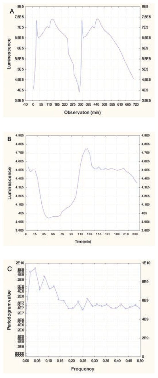 Change in luminescence in Allovibrio fisheri. Bacteria were re-suspended at 20 million cells/mL in 2% NaCl and luminescence was recorded at 5-min intervals for 3 h at 20°C under constant agitation. Luminescence oscillatory changes at 20 million cells/mL (A), luminescence for the first 50 observations (250 min) and frequency domain analysis (C) are shown.