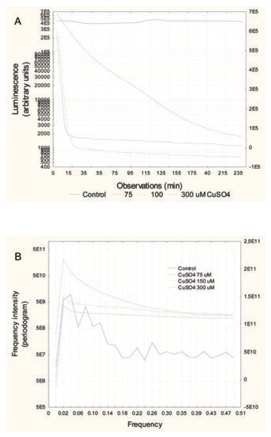 Change in luminescence in bacterial suspension exposed to CuSO4. Bacteria were re-suspended at 20 million cells/mL in 2% NaCl containing increasing concentrations of CuSO4. Luminescence was recorded at 5-min intervals for 3 h at 20°C under constant agitation. Recorded luminescence at each time (A) and frequency analysis by Fourier transformation (B) are shown.