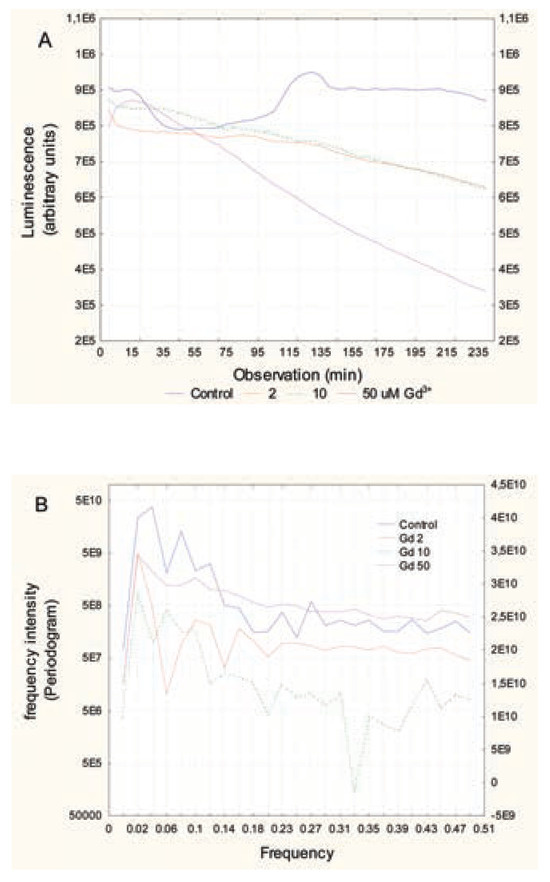Changes in luminescence over time in bacteria exposed to Gd. Bacteria were re-suspended at 20 million cells/mL in 2% NaCl containing increasing concentrations of GdCl3. Luminescence was recorded at 5-min intervals for 3 h at 20°C under constant agitation. Recorded luminescence at each time (A) and frequency analysis by Fourier transformation (B) are shown.