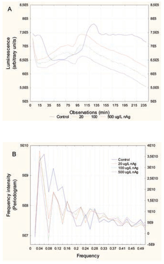 Change in luminescence over time in bacteria exposed to silver nanoparticles. Bacteria were re-suspended at 20 million cells/mL in 2% NaCl containing increasing concentrations of nanoAg. Luminescence was recorded at 5-min intervals for 3 h at 20°C under constant agitation. Recorded luminescence at each time (A) and frequency analysis by Fourier transformation (B) are shown.
