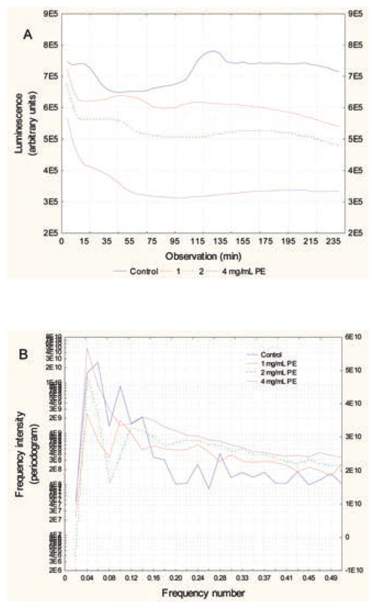 The exposure experiments were repeated N=3 times and mean luminescence values were reported at 5-min intervals for 250 min. The concentration that lowers bacterial luminescence by 20% (EC20) was calculated based on linear regression analysis. The data were also analyzed using Fourier transformation to determine the amplitude changes (periodogram) and frequency profiles (spectral analysis). Fourier analysis transforms any functions f(x,t) into functions in the frequency domain g(k). More precisely, g(k) = a0 + Σ[Ak ∗ cos(2π(kn/N) + Bk ∗ sin(2π(kn/N)], where n = 1 to N observations (time in the present case). The variable n represents the individual observations of the series expressed in time (min), and k is the frequency. The constants Ak and Bk are used to calculate the periodogram (Pg) value, which is related to the amplitude variance of the sine and cosine functions at each frequency k: Pg = (Ak 2 + Bk 2 )*N/2, where N is the total number of observations. The Pg value is thus related to the variance of the function at a given frequency. The significance of each Pg value was tested and compared to random noise using the Kolmogorov-Smirnov test (exponential adjustment). Phase shift analysis was also performed to determine changes in phases of the luminescence signal. All statistical tests were performed using the Statistica software package (France).