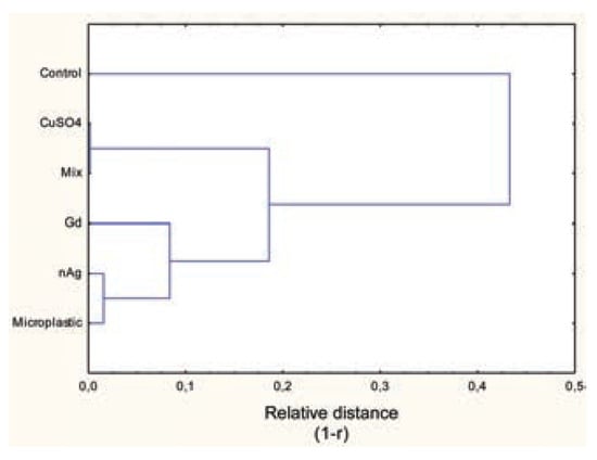 Hierarchical analyses of the first eight frequencies in luminescence changes. The periodogram value of the first eight frequencies was used to classify the quorum-sensing properties of the selected contaminants in bacterial suspension. Mixture was composed of the lowest concentration of CuSO4 (75 μM), GdCl3 (30 μM), nAg (20 μg/L) and microplastic beads (1 mg/mL).