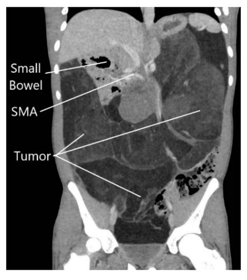 A previously healthy 15-year-old male was referred to our hospital presenting with early satiety, 20 kg weight loss (body mass index = 18.1 kg/m2), and abdominal fullness on exam. Abdominal computed tomography (CT) revealed a massive retroperitoneal tumor shifting the entire small bowel into the right upper quadrant, with significant lateral displacement of the superior mesenteric artery (SMA) from its normal anatomic course (Figure 1). The tumor was compressing all intra-abdominal organs, including the stomach, likely causing his symptoms of early satiety. Percutaneous biopsy of the mass demonstrated a well-differentiated liposarcoma. Chest CT did not show any evidence of lung metastases.