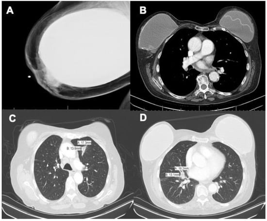 - Ryu, A.J.; Glazebrook, K.N.; Samreen, N.; Bauer, P.R.; Yi, E.S.; Ryu, J.H. Spectrum of Chronic Complications Related to Silicone Leakage and Migration. Am. J. Med. 2018, 131, 1383–1386. [Google Scholar] [CrossRef] [PubMed]