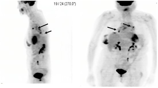 PET/CT demonstrating increased uptake with multiple mediastinal lymph nodes with a nodule in the right middle lobe and a spiculated left lung nodule with concern for breast involvement: the black arrows point to areas of suspicion.