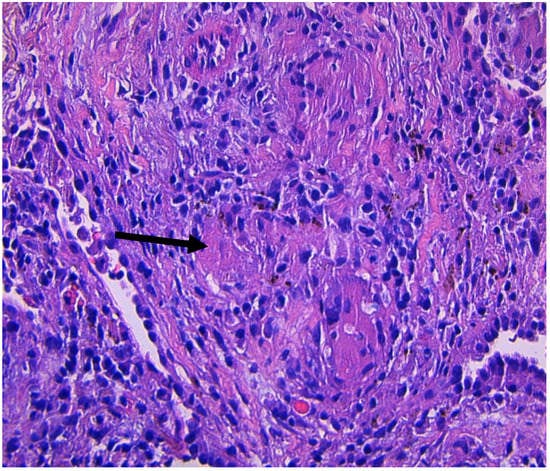 Non-caseating granuloma from a CT-guided biopsy of the left lung nodule showing an asteroid body (black arrow), a typical finding in granulomas.