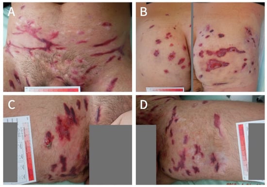 At the end of March 2018, the wounds had healed to a great extent and, at that point in time, the patient already felt a significant improvement in life quality with a DLQI of 14 points and pain NRS of 0 points. He restarted LAight therapy on a monthly interval to manage recurrence (as in Figure 2C) and to improve scarring. By that time, he had also quit smoking.