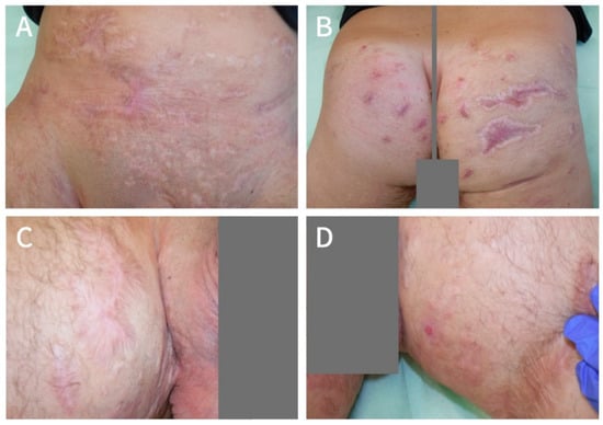 In July 2017, a 31-year-old male patient presented to the WZ-WundZentrum in Dusseldorf, Germany, with a widespread Hurley stage II HS in both thighs and groins as well as in the mons pubis area, lower abdomen and buttocks (Figure 1A, Figure 2A and Figure 3A). He was a light smoker (three cigarettes per day), had a BMI of 27 kg/cm2, and reported no relevant comorbidities.