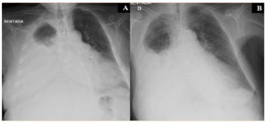 Thoracic X-Ray showing increased cardiac index and a large right pleural effusion, before thoracentesis (A); Thoracic X-Ray showing less prominent right pleural effusion, after thoracentesis (B).