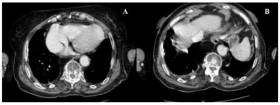 Thoracic-abdominal-pelvic CT, performed after eight cycles of chemotherapy, showing radiological improvement, without lymphomatous masses in right superior lobe (A) or right pleural effusion (B).
