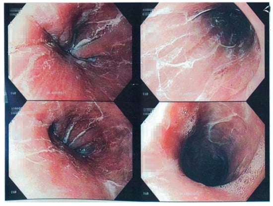 - Carmack, S.W.; Vemulapalli, R.; Spechler, S.J.; Genta, R.M. Esophagitis dissecans superficialis (“sloughing esophagitis”): A clinicopathologic study of 12 cases. Am. J. Surg. Pathol. 2009, 33, 1789–1794. [Google Scholar] [CrossRef] [PubMed]