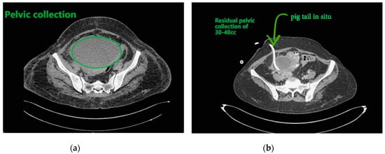 (a) Pelvic collection; (b) showing residual collection in pelvis with drainage catheter in situ.