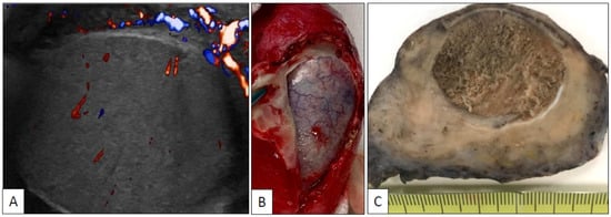 Echo-doppler of the left testicle shows diffuse ischemic infarction (A); left orchiectomy specimen (B) showing complete testicular necrosis and thickening of the spermatic cord and peri-testicular coverings (C).