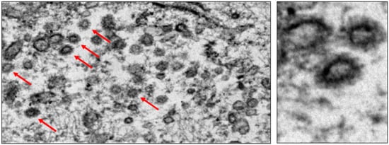 Spiked viral particles were identified within the cytoplasm of endothelial cells.