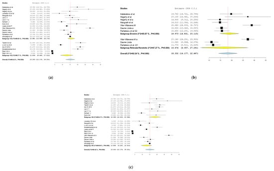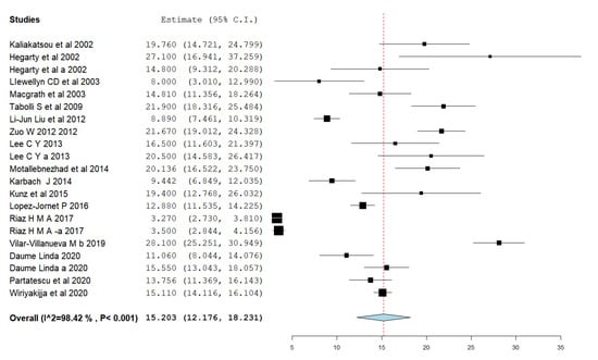 The pooled effect estimate (Baseline) (Table 4) calculated using the random-effects method (DerSimonian and Laird method) was computed to be 15.20, [95% CI 12.176 and 18.231], with a statistically significant heterogeneity (I2 = 98.42%; p < 0.0001) (Figure 2).