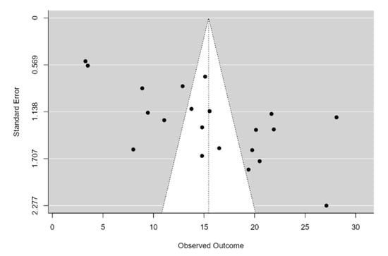 Considering the high degree of heterogeneity, subgroup analysis based on age (>52 vs. <52 years), female proportion (>60% vs. <60%), and clinical type (keratotic/reticular vs erosive/ulcerative/bullous) was conducted (Figure 3a–c). The test for age subgroup differences suggested no statistically significant subgroup effect (p = 0.21), meaning that age does not modifies the impact of OLP on OH-QoL. Subgroup analysis for female proportion in samples showed a statistically significant subgroup effect (p = 0.07), meaning that gender statistically significantly modifies the impact of OLP on OH-QoL. The impact of OLP on OH-QoL appeared greater in studies with a larger number of females than males; therefore, the subgroup effect is quantitative. Few studies analyzed OH-QoL in the different clinical forms of OLP. Subgroup analysis based on clinical forms showed no statistically significant effect of clinical type of OLP on OH-QoL (p = 0.84). There was no difference in OH-QoL between reticular, keratotic, erosive, bullous, atrophic types of OLP. Egger’s test for a regression intercept was significant (p < 0.001), indicating evidence of publication bias (Figure 4).