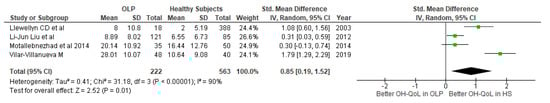 A meta-analysis of OH-QoL in OLP patients versus healthy patients showed poor OH-QoL (SMD 0.85, 95% CI, 0.19 1.52, p = 0.01, I2 = 90%) in OLP patient as compared to healthy controls (Figure 5). This confirmed our finding that OLP has an impact on OH-QoL. When the effect of treatment on OH-QoL in OLP was evaluated, it was observed that the treatment could improve the OH-QoL. However, this was applicable only to the symptomatic type of OLP, considering that most studies included the symptomatic type of OLP in their analyses. Further, a comparison between asymptomatic and symptomatic OLP should be performed.