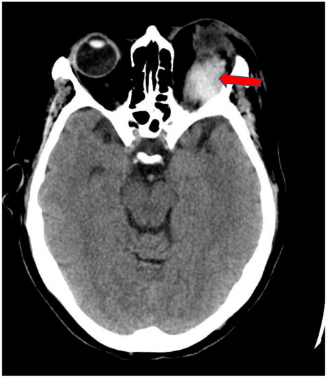 Sagittal view of Brain CT scan showing left soft tissue swelling with hyper dense mass in the left superior orbit measuring 3.7 × 2.9 × 1.5 cm (Arrow).