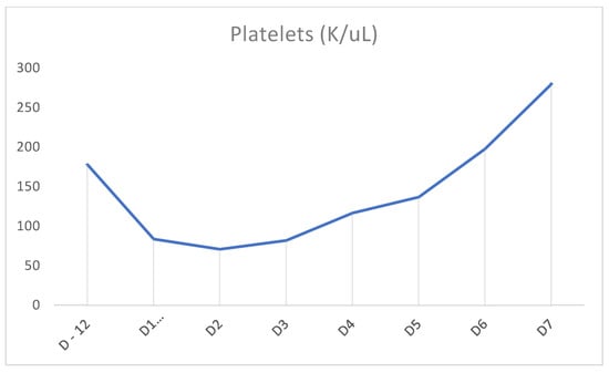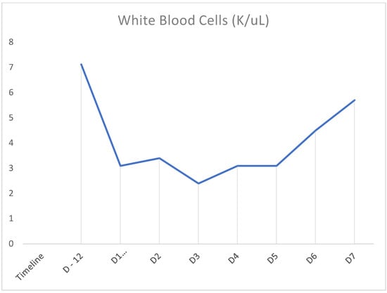 Timeline demonstrating white blood cell counts on prior admission (D-12) and rise in counts after cessation of TMP-SMX on D1 of admission.