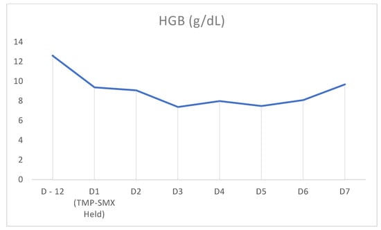Timeline demonstrating hemoglobin counts on prior admission (D-12) and rise in counts after cessation of TMP-SMX on D1 of admission.