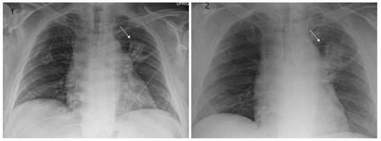 Even though X-ray is non-specific to pneumonitis, it is usually the first investigation performed. During the early phases, the most common finding on chest radiograph is perivascular haziness which frequently progresses to alveolar opacities [39]. Chest radiographs can show ground-glass opacity and/or consolidation in the radiation port. Consolidation usually has a nodular appearance but can be more confluent/lobar along with the irradiated port. Findings can be seen outside the radiation port as well. Some uncommon findings are ipsilateral pleural effusion with or without adjacent atelectasis [66]. Chest radiograph can also show bilateral interstitial infiltrates mimicking heart failure or acute respiratory distress syndrome (ARDS) [69,70]. All irradiated patients usually have some degree of abnormalities in the X-rays. Some fail to show any radiographic evidence of lung injury with pneumonitis. Early features exhibiting mild opacification of vascular markings are common, with later stages showing dense opacities. A radiographic straight-line effect may indicate the direction of the radiation port along the lines of pneumonitis [39,71] (Figure 1).