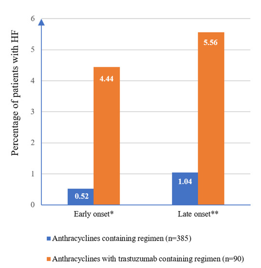 Incidence of HF according to onset (n = 475). * Early onset refers to HF occurs during the year after the completion of chemotherapy. ** Late onset refers to HF occurs later than a year after chemotherapy has been completed.