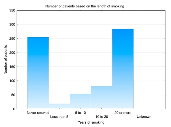 Number of patients based on the length of smoking in years. A similar number of patients reported never smoking (N = 255) and smoking 20 years or more (N = 284); both much higher numbers compared to patients who smoked for less than 5 years (N = 19), from 5 to 10 years (N = 52) and from 10 to 20 years (N = 81). No data is available for four patients.