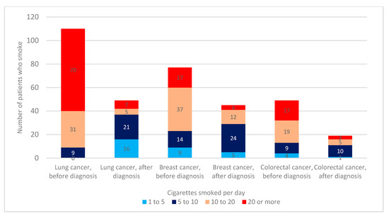 Prior to the cancer diagnosis, more than 10 cigarettes per day were smoked by 70%, 73%, and 92% of breast, colorectal, and lung cancer smoker-patients, respectively. However, during the cancer treatment, the ratio reversed, with 36% of breast cancer, 42% of colorectal cancer, and 24% lung cancer patients reporting smoking >10 cigarettes a day (Figure 3).