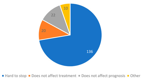 Finally, we asked our patients who still smoked the reason for the continuation of smoking, allowing more than one answer. Only 11% (N = 20) stated they did not believe smoking affected treatment and a similar number (N = 22, 12%) stated that they believed smoking did not affect prognosis, with 10 patients (5%) stating ‘other’ as a reason for not stopping (Figure 4).