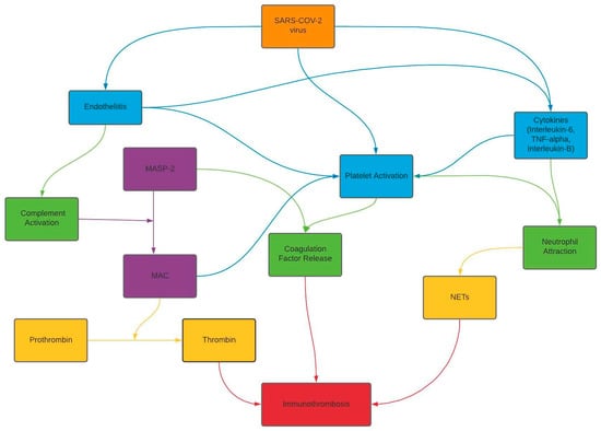 Flow chart depicting the multiple factors contributing to the hypothesized mechanisms of thrombus formation secondary to SARS-CoV-2 virus infection.