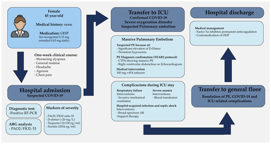 Timeline of events of the clinical case showing laboratory results. Clinical findings and medical decisions. OHP = oral hormonal contraceptives, RT-PCR = retro-transcriptase polymerase chain reaction, ICU = intensive care unit, PE= pulmonary embolism, AB = antibiotics.